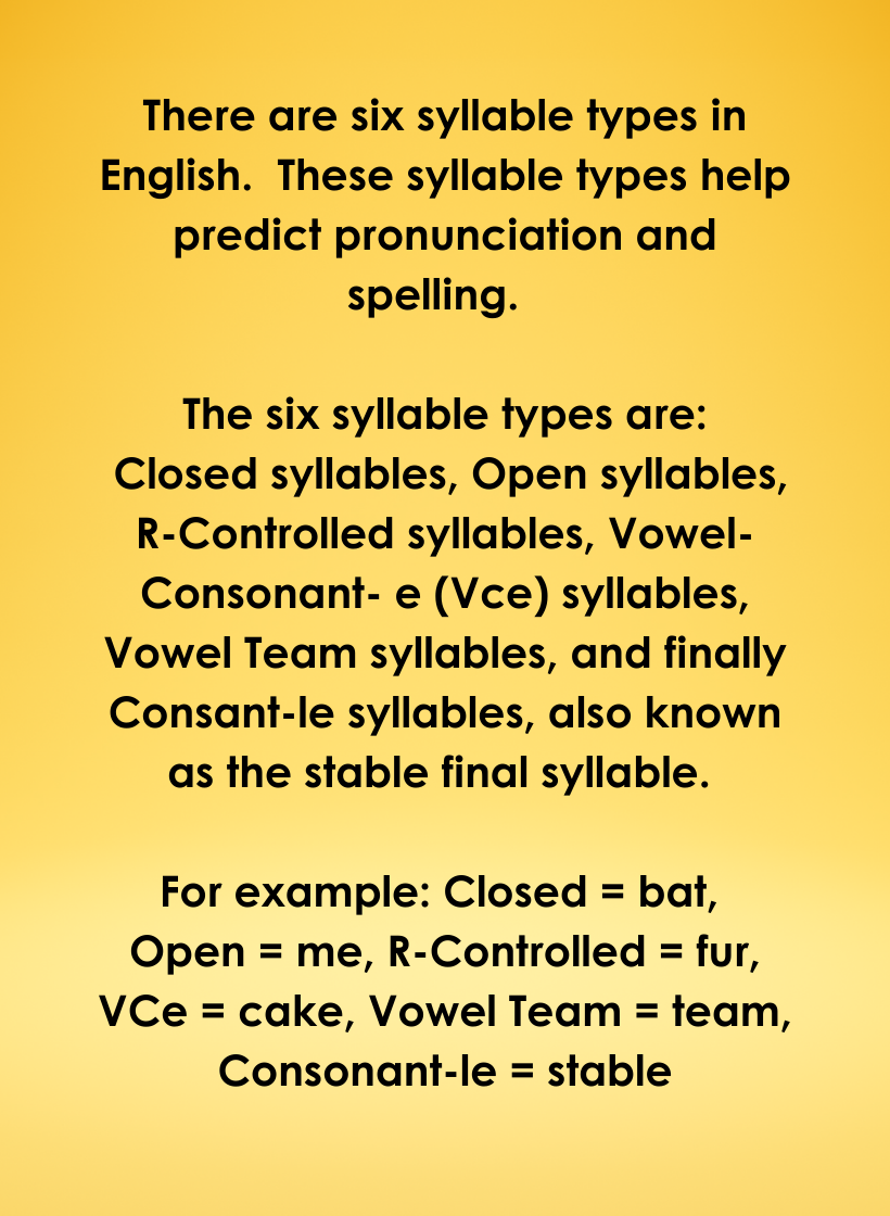 This is a set of 6 decks of 54 cards each, with each deck focusing on one syllable type. Mix and match the decks to meet the needs of your players!